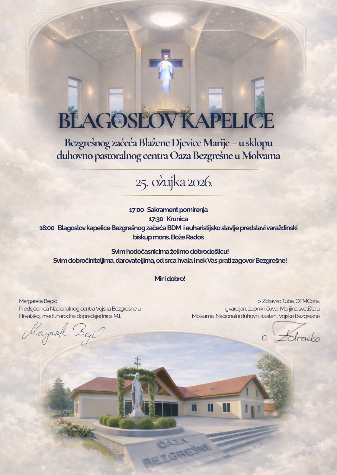 Varaždinski biskup Bože Radoš blagoslovit će u srijedu, 25. ožujka, kapelicu Bezgrešnog začeća Blažene Djevice Marije - u sklopu duhovno pastoralnog centra Oaza Bezgrešne u Molvama.