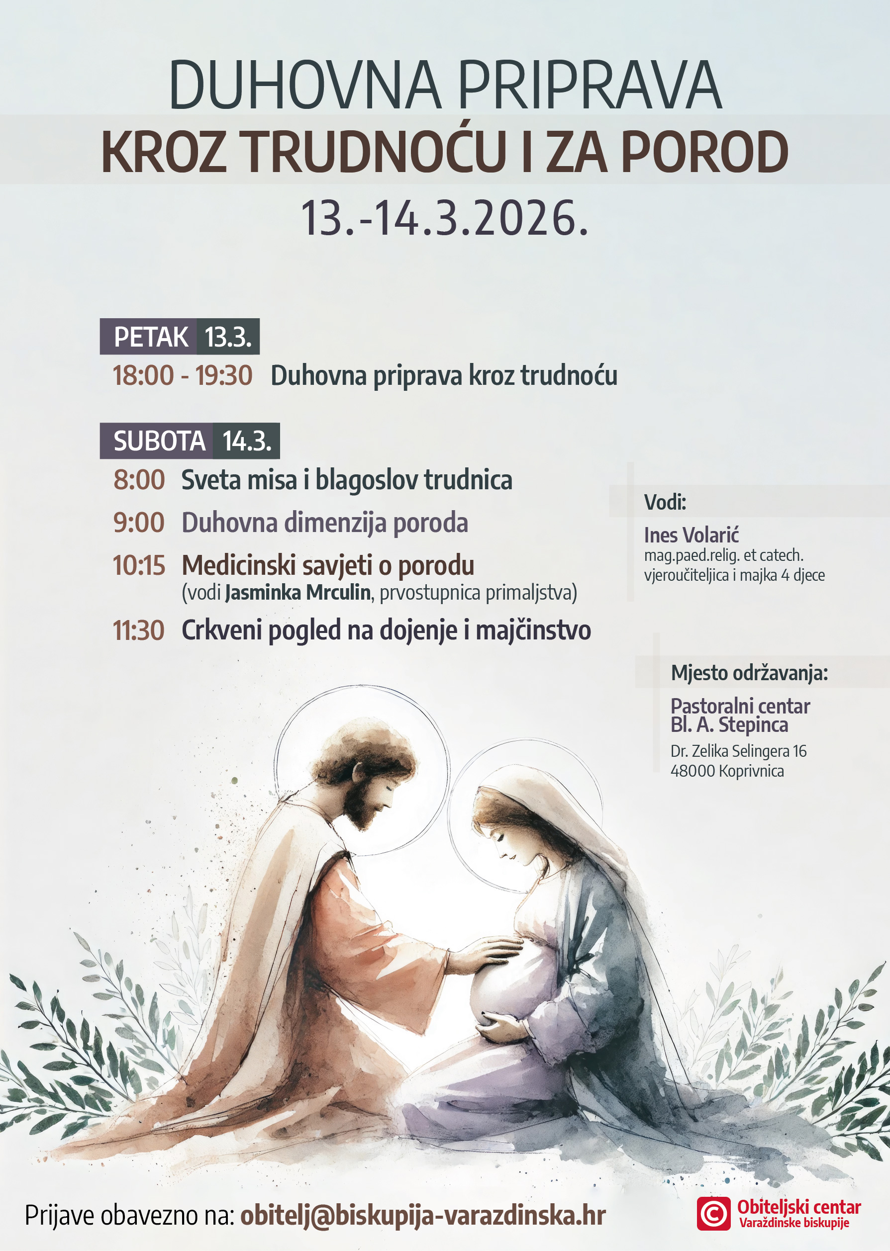 Duhovna priprava kroz trudnoću i za porod održava se 13. i 14. ožujka u Pastoralnom centru Bl. A. Stepinca u Koprivnici, a vodi je vjeroučiteljica i majka četvero djece Ines Volarić, uz podršku Obiteljskog centra Varaždinske biskupije.