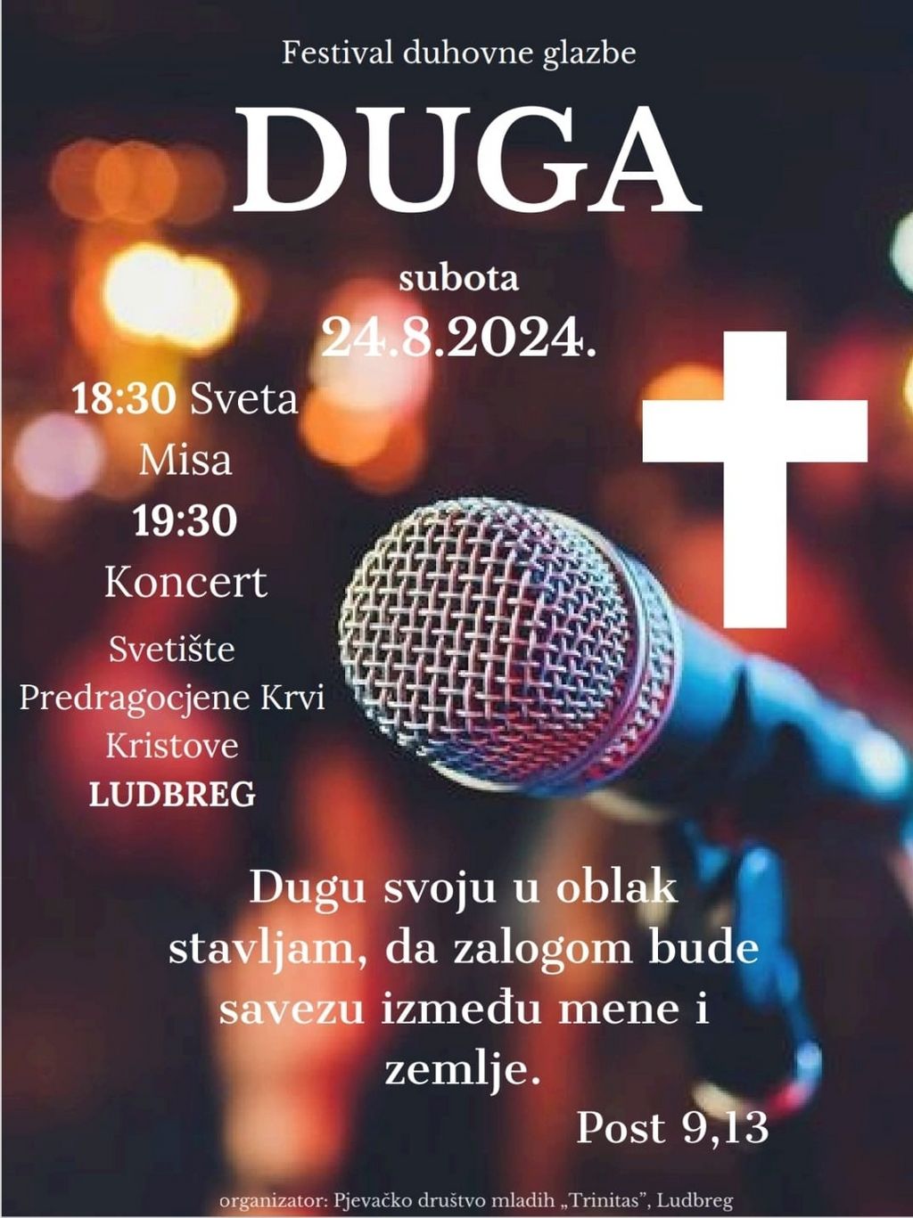 Dani Svete nedjelje u Ludbregu započinju Festivalom duhovne glazbe „Duga“ u subotu 24. kolovoza. Festival organizira Pjevačko društvo mladih „Trinitas“ iz Ludbrega, a održat će se u 19:30 na prostoru Svetišta. Prije koncerta će biti misa u 18:30.