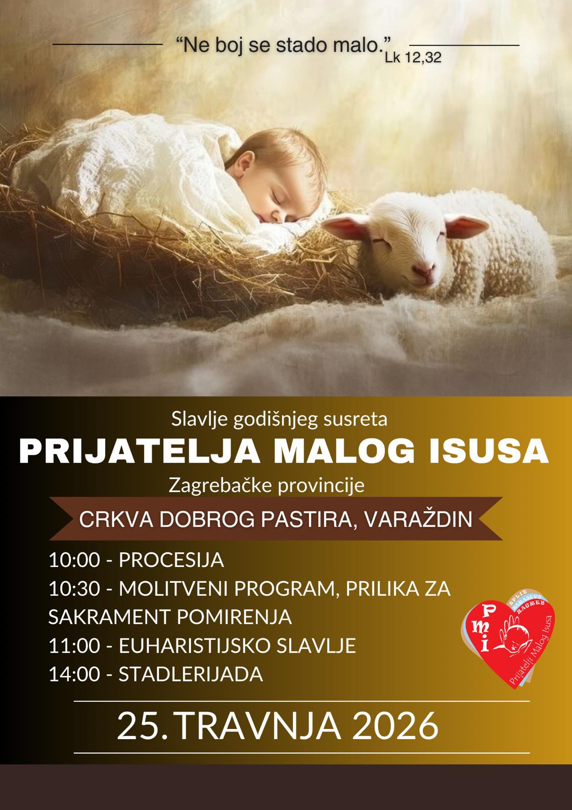 U župi sv. Fabijana i Sebastijana u subotu, 25. travnja, održat će se slavlje godišnjeg susreta Društva Prijatelja Maloga Isusa zagrebačke provincije pod geslom “Ne boj se stado malo” (Lk 12,32).