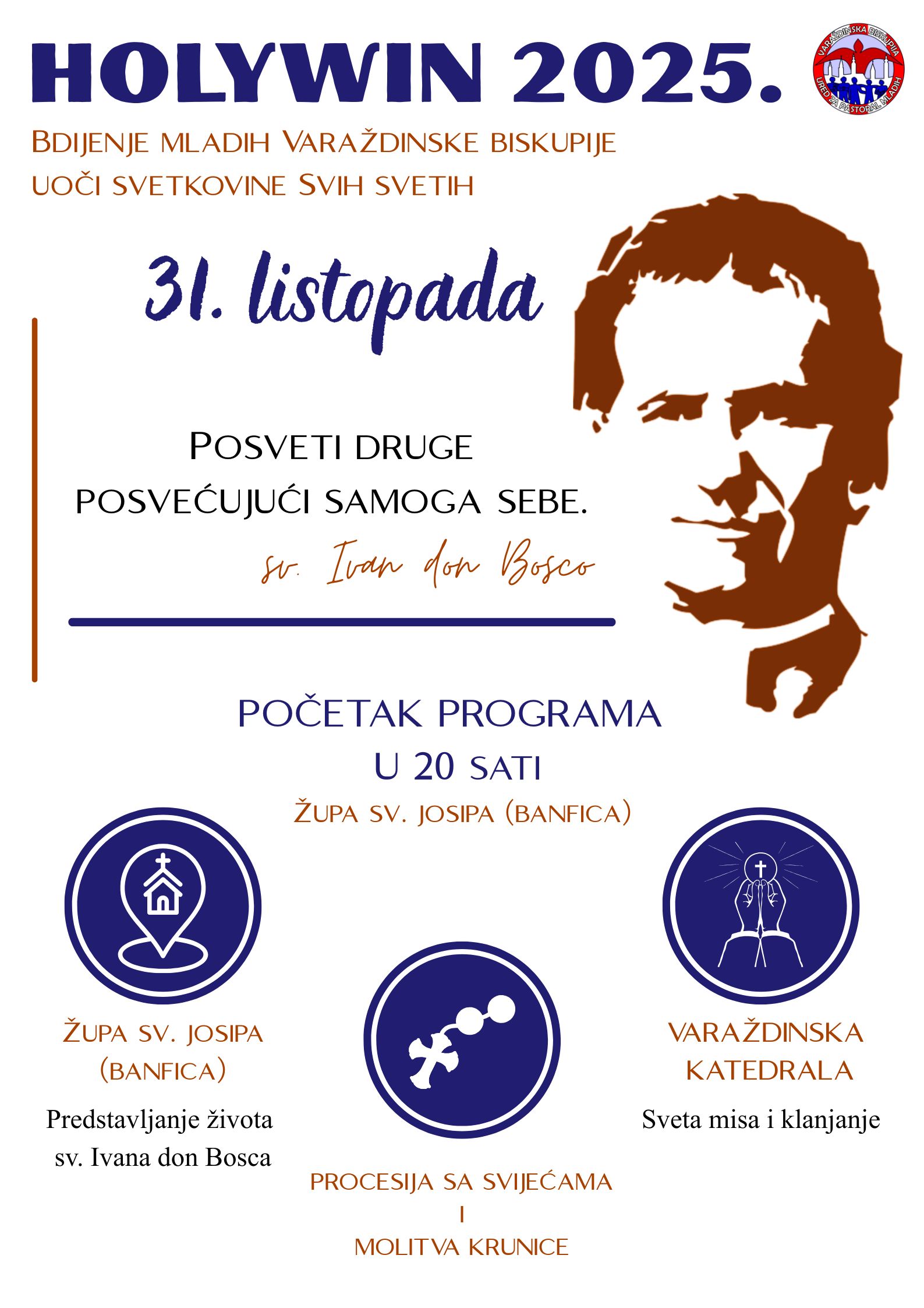 Holywin započinje u četvrtak, 31. listopada, u 20:00 sati na Banfici. Salezijanska mladež predstavit će lik sv. Ivana don Bosca, a potom će sudionici u procesiji s molitvom krunice krenuti prema varaždinskoj katedrali.