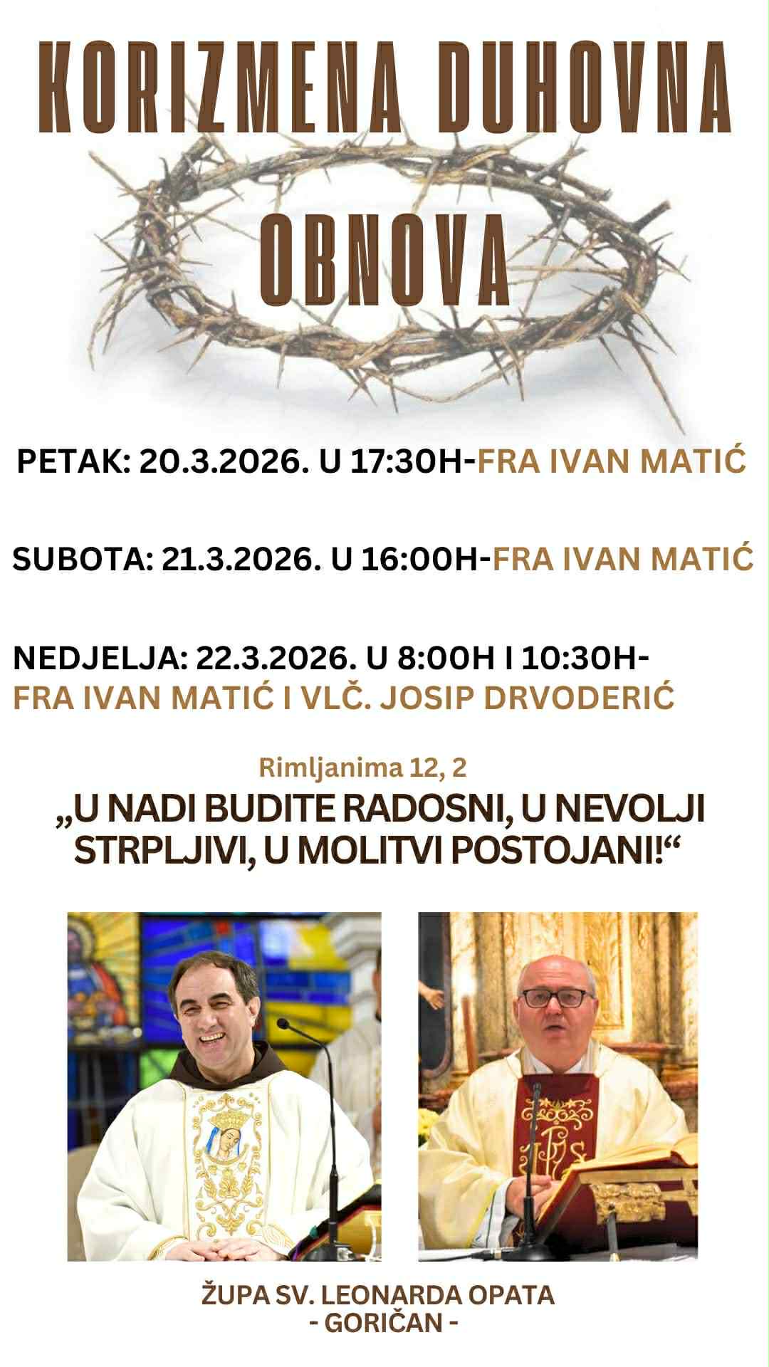 Župa sv. Leonarda Opata u Goričanu organizira korizmenu duhovnu obnovu koju će od petka 20. do nedjelje 23. ožujka predvoditi fra Ivan Matić, voditelj Kuće susreta Tabor.