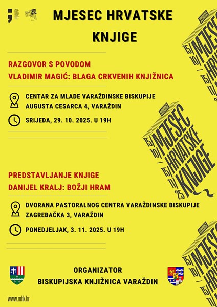 Tako će razgovor s povodom, u organizaciji Biskupijske knjižnice Varaždin, biti s Vladimirom Magićem na temu "Blaga crkvenih knjižnica" u srijedu 29. listopada, u Centru za mlade Varaždinske biskupije (Augusta Cesarca 4) s početkom u 19h sati.