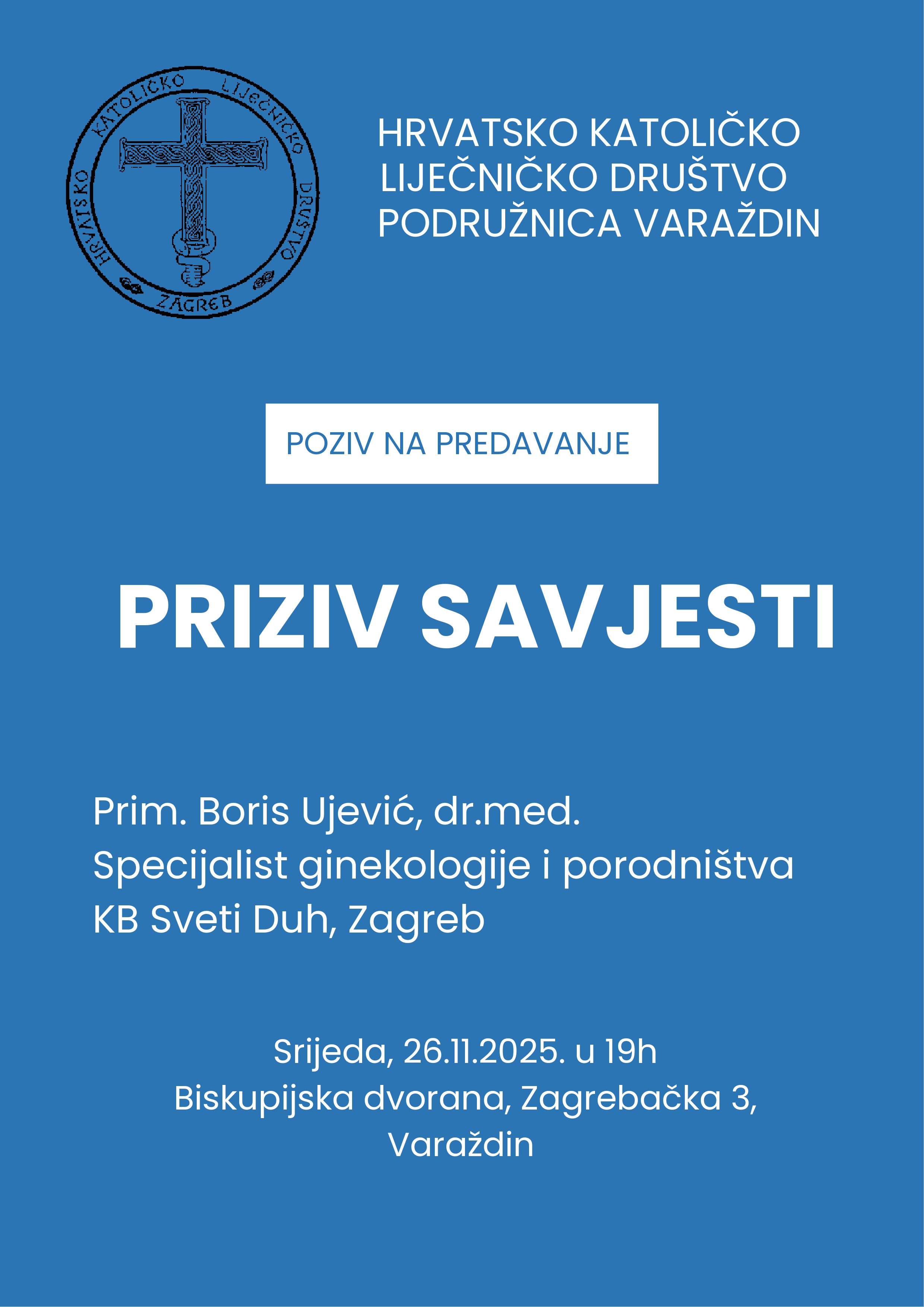 Hrvatsko katoličko liječničko društvo, Podružnica Varaždin, poziva sve zainteresirane na predavanje pod nazivom „Priziv savjesti“. Predavanje će se održati u srijedu, 26. studenoga 2025. godine u 19 sati u Biskupijskoj dvorani, Zagrebačka 3 u Varaždinu.