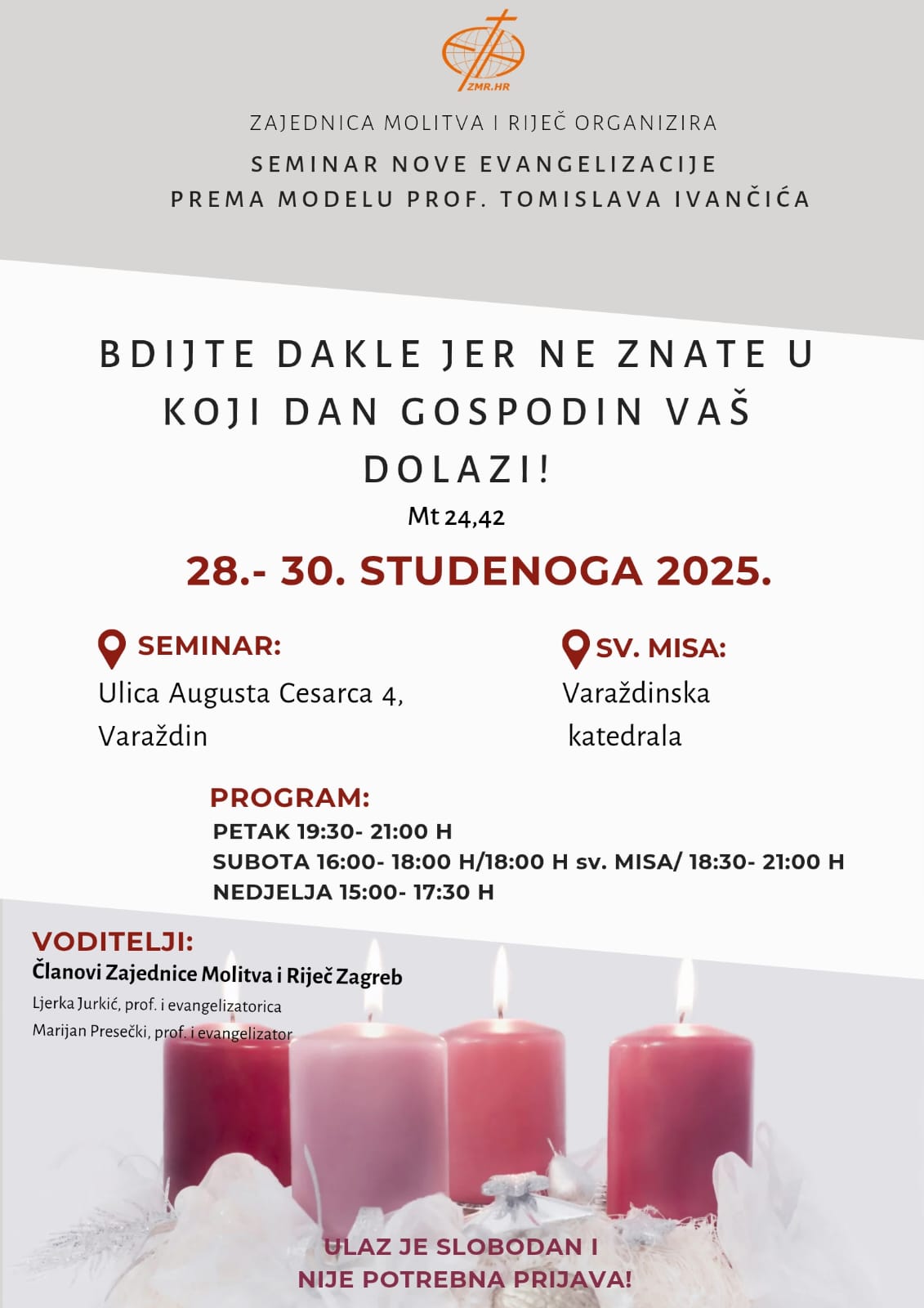 Zajednica Molitva i Riječ organizira seminar nove evangelizacije prema modelu prof. Tomislava Ivančića, koji će se održati od 28. do 30. studenoga 2025. godine u prostorima Varaždinske biskupije, Ulica Augusta Cesarca 4, Varaždin.
