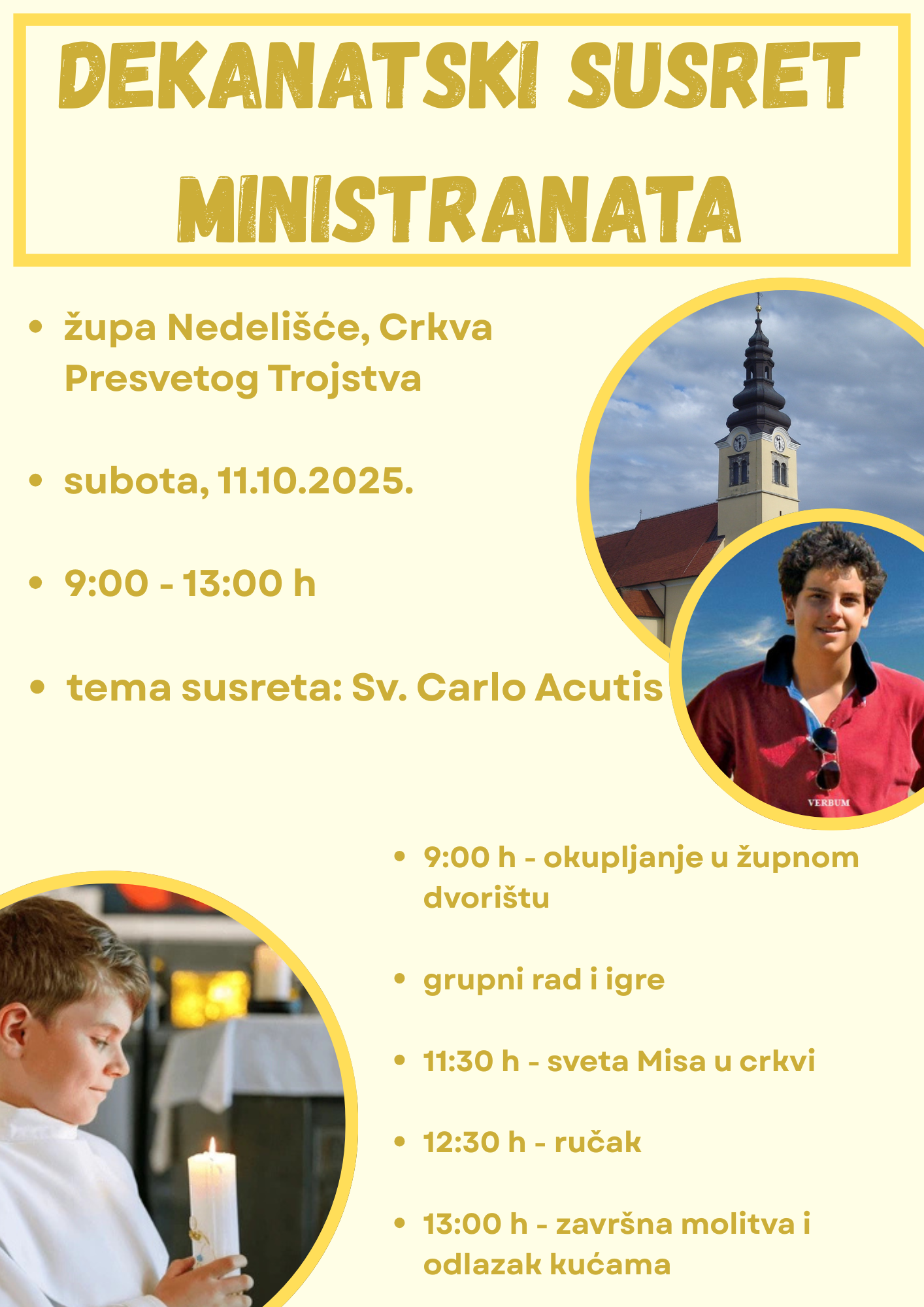 U organizaciji povjerenika za mlade Štrigovskog dekanata vlč. Filipa Jakupeca u subotu, 11. listopada, održat će se dekanatski susret ministranata u Župi Presvetog Trojstva u Nedelišću.
