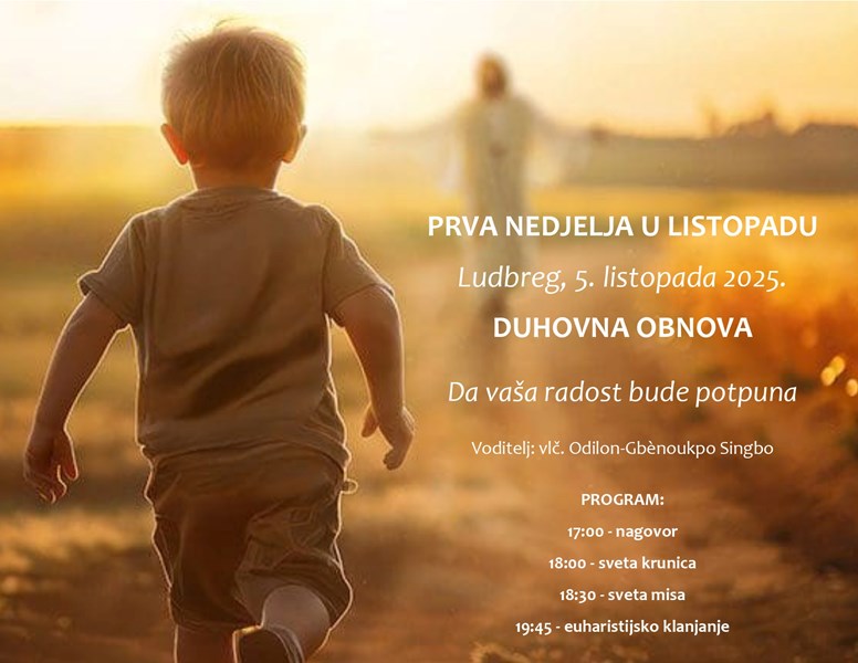 Nakon godišnje proslave Predragocjene Krvi Kristove u Ludbregu prve nedjelje u rujnu, u ludbreškom svetištu nastavljaju se Duhovne obnove prve nedjelje u mjesecu. Tako će 5. listopada duhovnu obnovu predvoditi vlč. Odilon Singbo profesor na Hrvatskom katoličkom sveučilištu u Zagrebu. Duhovna obnova na temu “Da radost vaša bude potpuna” započinje u 17 sati. Nakon duhovnog nagovora slijedi molitva krunice, slavlje svete mise i euharistijsko klanjanje.