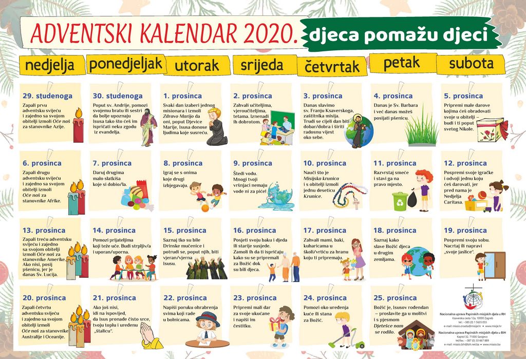 Ove godine će naša djeca i mladi živjeti četiri tjedna došašća uz dječaka iz Misije Tatale, u Gani, gdje djeluje hrvatski misionar don Ivan Stojanović. Iz tjedna u tjedan dječak će im pričati o svojoj obitelji, o svojoj školi, kako kod njega slave svetu misu i Božić. Na taj način naša će djeca moći usporediti svoje iskustvo s njegovim.I ove godine mali misionari pripremat će se za Božić uz misijski adventski kalendar. U njemu, uz molitvu, svakodnevno im je predložena djelatna ljubav, kroz zahvalnost, dijeljenje, pomoć, pozdrav i znanje. Djeca će upoznati Ganu i preko karte, sa zanimljivim činjenicama o toj zemlji.