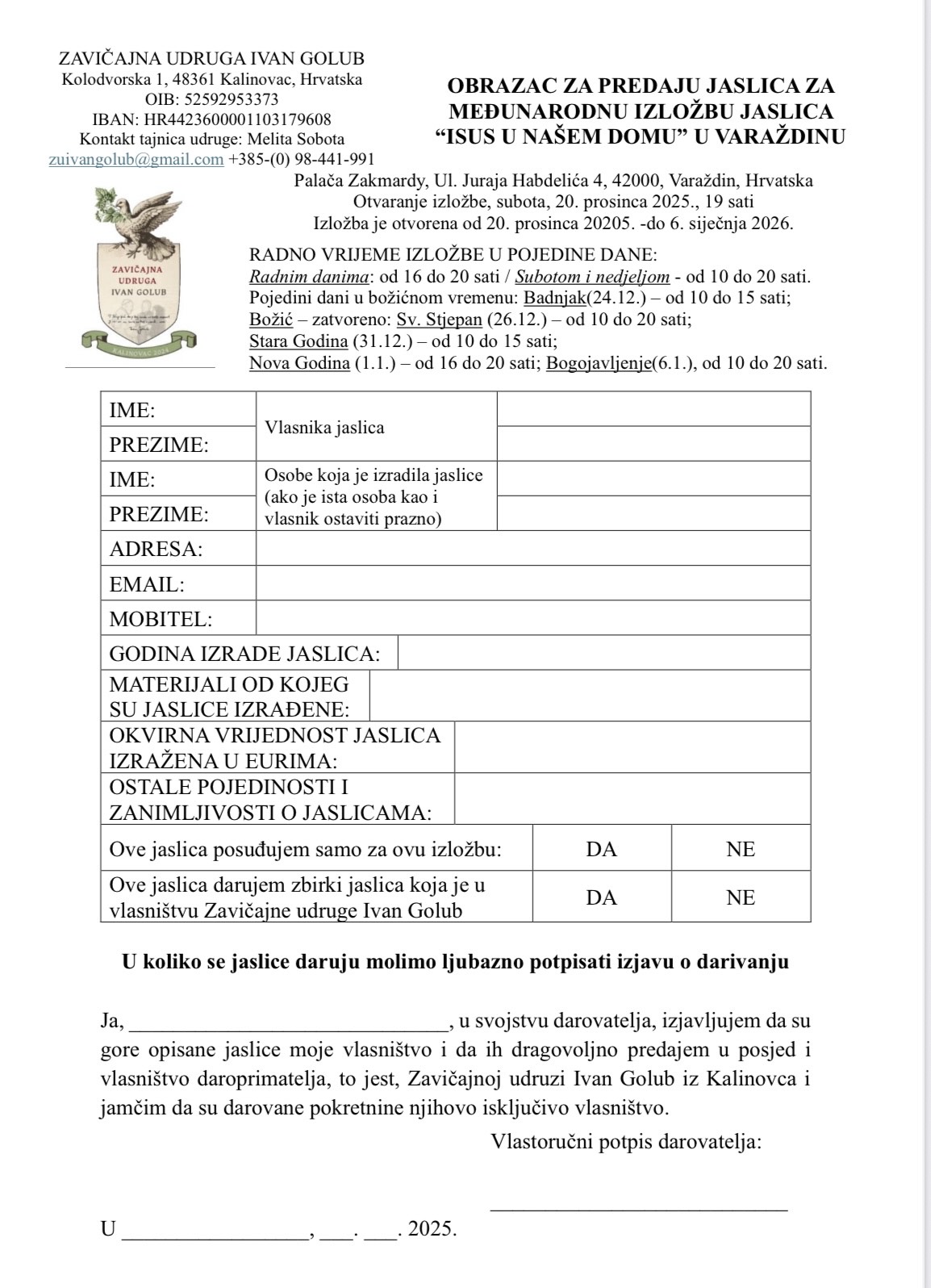 Pozivamo sve zainteresirane pojedince, ustanove, udruge, župe, redovničke zajednice, škole i vrtiće koji žele sudjelovati na izložbi izlaganjem jaslica koje su izradili, neka dostave slike jaslica na ovaj broj mobitela (WhatsApp) +385 98 4419 91 (Melita Sobota, tajnica udruge) ili e-mail zuivangolub@gmail.com najkasnije do petka, 21. studenoga 2025.
