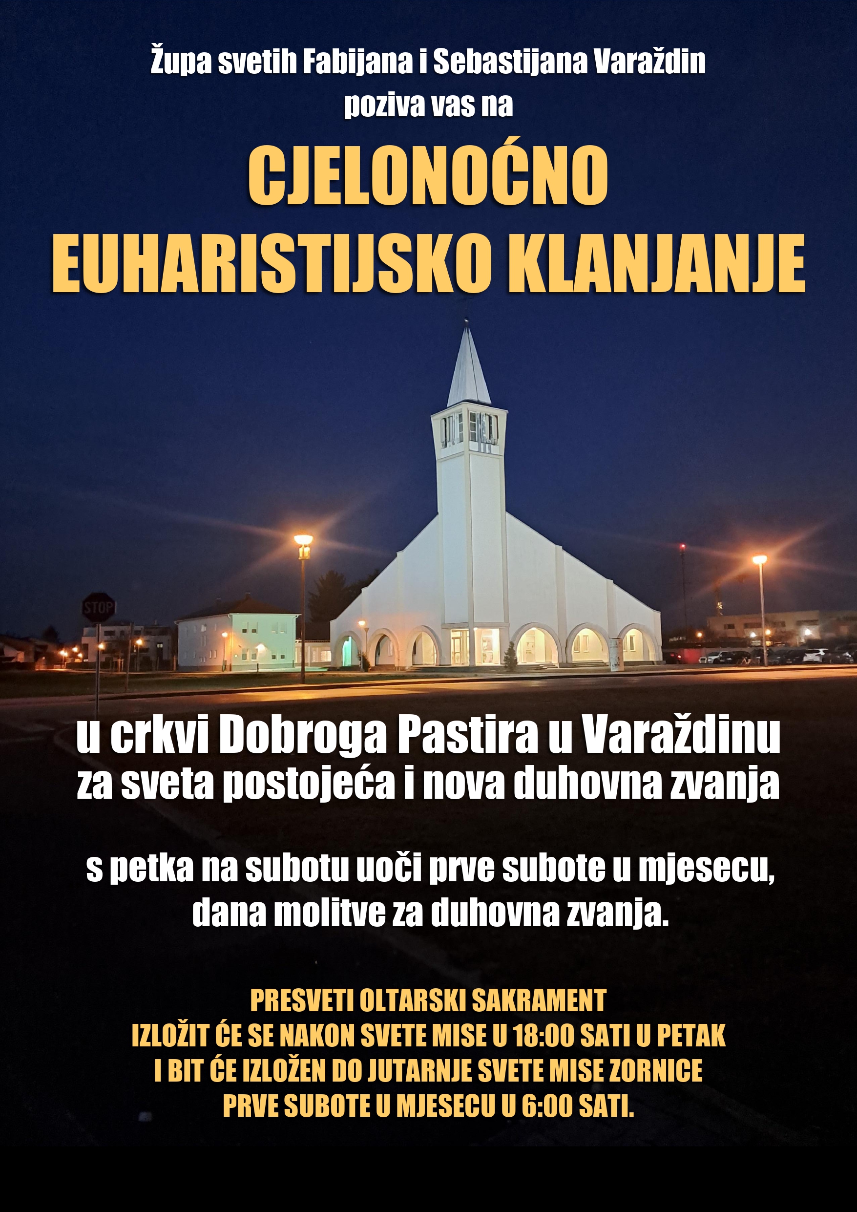 Podsjetimo, u crkvi Dobroga Pastira u Varaždinu održava se i cjelonoćno euharistijsko klanjanje za sveta postojeća i nova duhovna zvanja s petka na subotu uoči prve subote u mjesecu. Tako će i ovog puta Presveti Oltarski Sakrament bit izložen u petak, 5. prosinca, nakon svete mise u 19 sati, sve do jutarnje svete mise prve subote u mjesecu 6. prosinca u 6 sati.